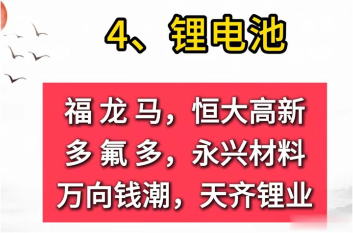 - 恒大高新:虽主营防磨抗蚀,但或有涉足锂电池相关材料的可能。